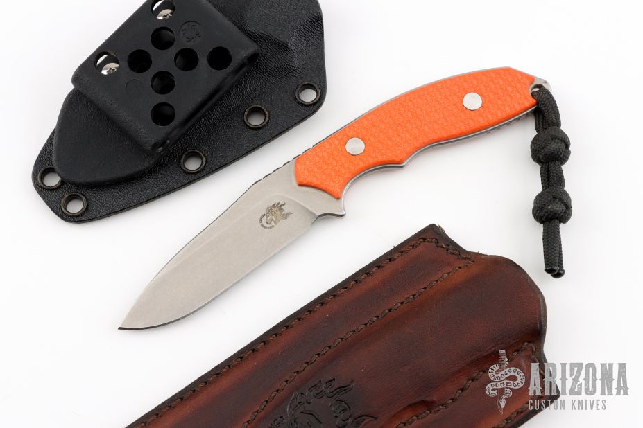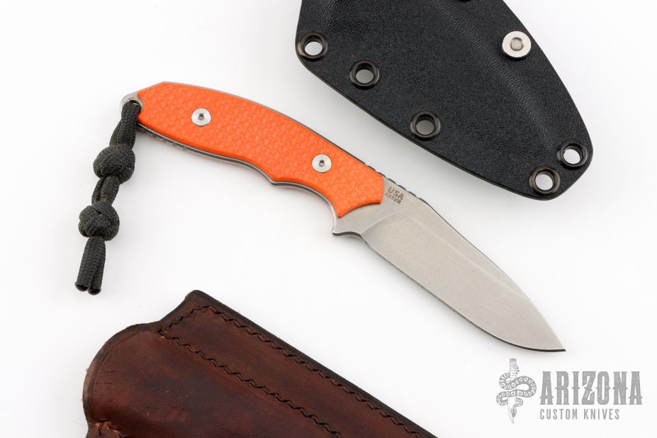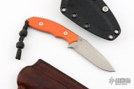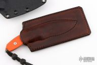 This Flashpoint from Hinderer Knives features 1/8" blade thickness and 7/8" blade depth. Notches on thumbrest and rear underside of handle. Textured orange G-10 scales. Includes Kydex sheath with ball chain and a brown leather sheath. Excellent Condition.
