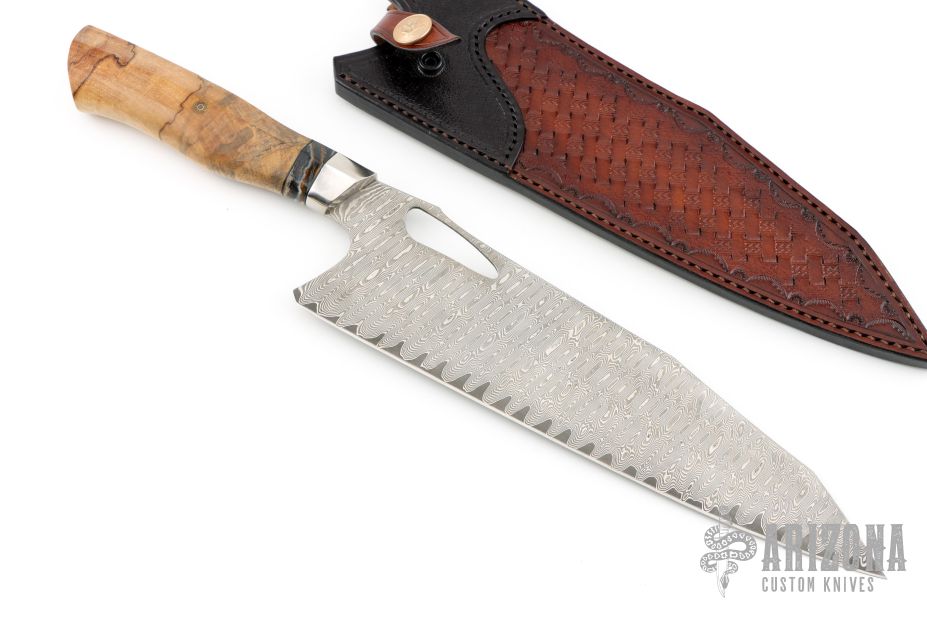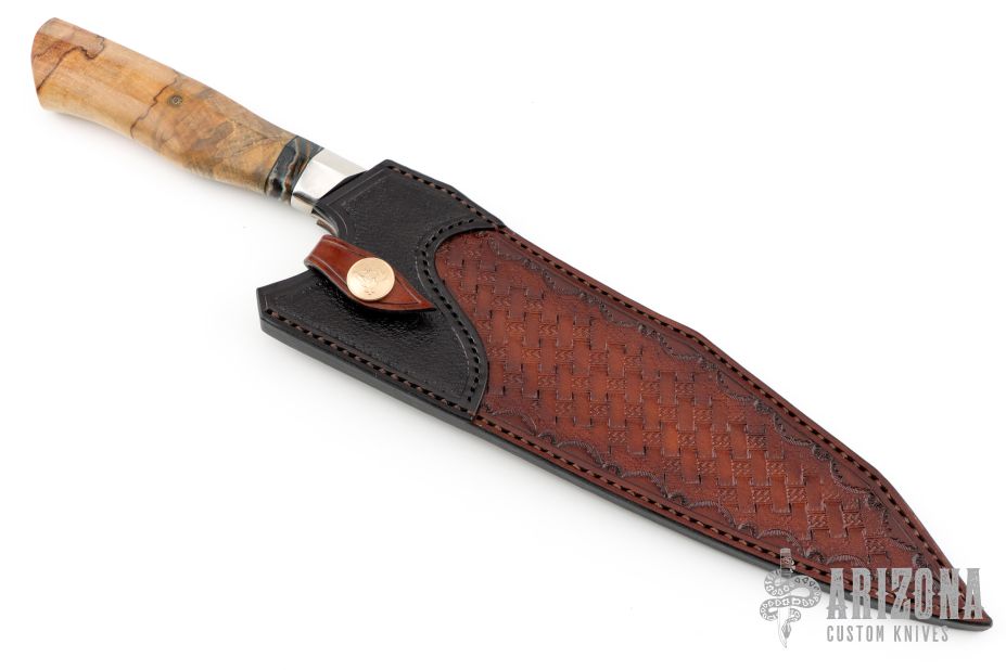 This knife by Benjahmin Knives features a San-Mai Damascus blade with .086" blade stock and 2.36" blade depth, hidden tang construction. The handle has a polished guard, mammoth and black spacers with wood grip. Comes with original box and hand tooled leather sheath. New from maker. NOTE: the Damascus has a couple inclusions on the blade, otherwise functionally its fine.
