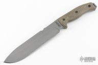 This knife features a stonewashed drop point blade with a notched thumbrest and a full tang construction.  .190" Blade Stock.  1.608" Blade Depth.  The handle has micarta scales.  Excellent Condition.