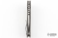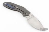 This J2 by Mick Strider features a stonewash finish blade with notched thumbrest and a thumbhole. The handle has a Frag pattern titanium frame with tip up reversible clip. Nice detent, lockup and blade seating. Has some marks on the clip, otherwise excellent condition. This knife has been modified and does not have any warranty with Strider Knives.