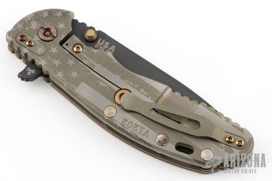 This Vintage Series XM-24 from Hinderer Knives features a black 01 Tool Steel blade with swedge, dual thumb studs, notched thumb rest and flipper. The handle is comprised of a textured walnut scale with a titanium liner on the "A" side and a tumbled and anodized titanium lockside, pocket clip, hardware and lock bar stabilizer, and lanyard hole in pommel. Includes the original box and extra hardware. Excellent Condition.