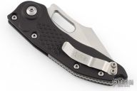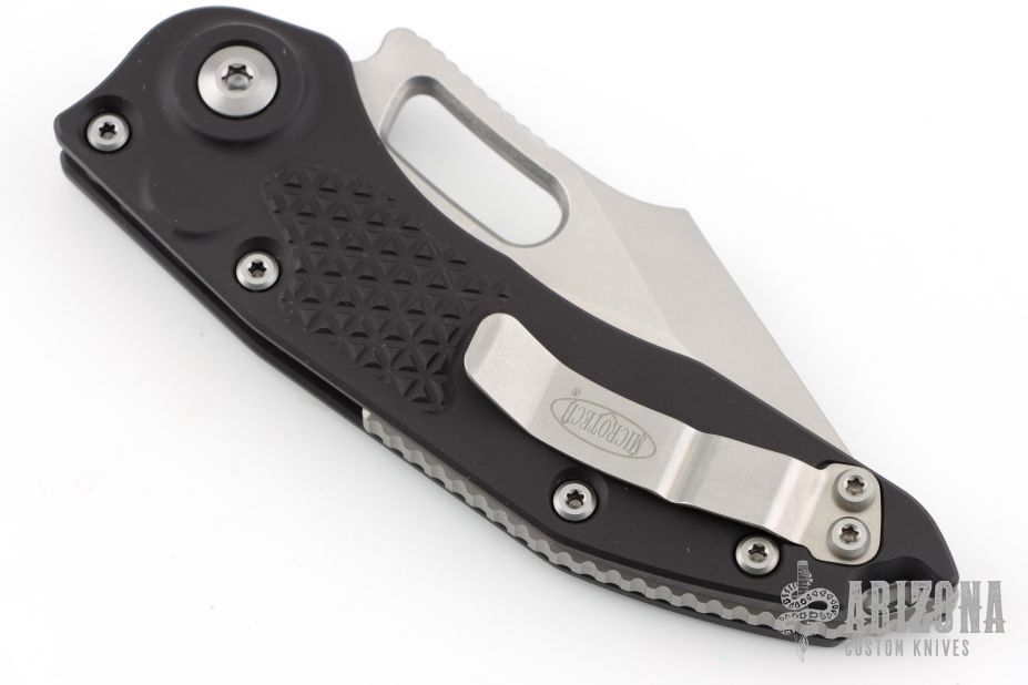 This Stitch Auto by Microtech Knives features a stonewash finished blade and false top edge, notched thumb and finger rests. The handle has a black milled aluminum handle with a bead blasted titanium backspacer and a bead blasted stainless  steel clip, tip up carry, lanyard hole at the butt. Comes with original box and papers. S/N of 11320 and dated 11/2022. Excellent condition.
