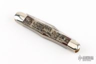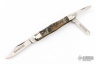 This Whittler by Queen Cutlery features three mirror finished blades. The handle has nickel silver bolsters, jigged camo covers, brass liners and stainless steel springs. Comes with original box and paper. Has some light scratches, otherwise excellent condition.  Marked prototype on the box.