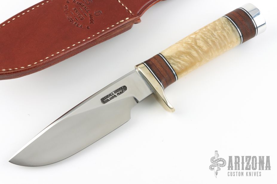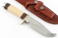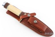 The Model 25-5 by Randall Made Knives is a drop point hunter similar to Model 11, but handle construction is reminiscent of 1930′s design. Excellent skinning, outdoors knife. This knife has a Stainless steel blade with notched thumbrest, .218" blade stock and 1.357" blade depth, hidden tang construction. The handle has a nickel silver guard and duralumin pommel, musk ox grip with stacked leather and spacers. Comes with brown leather sheath and papers. Excellent condition.