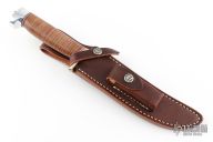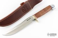 This model 3-7 by Randall Made Knives features a satin finished Stainless steel blade with a false top edge, .227" blade stock and 1.244" blade depth, hidden tang construction. The handle has brass guard and crow's beak duralumin butt with a stacked leather grip. Comes with a brown leather sheath and original papers. Excellent condition.