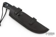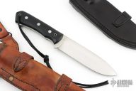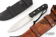 This Camp Knife by Dave Beck features a hand rub satin finished blade with .246" blade stock and 1.547" blade depth, full tapered tang construction. The handle has black paper micarta scales. Comes with 4 leather sheath. Has some light pitting, otherwise excellent condition.