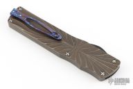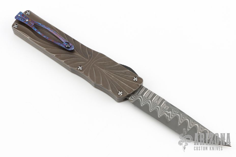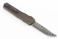 This Twist Tighe OTF by Brian Tighe features a tanto Damacore multi-ground blade. The handle has a distressed fluted titanium body, tip down TigheMascus clip with ruby ball insert, has ruby ball insert in the butt as a glass breaker, has a carbon fiber thumbslide. Comes with a zippered case and papers from the show, #6. Has some light scuffs and scratches, excellent condition otherwise.