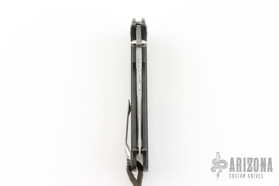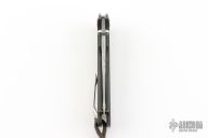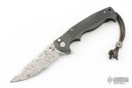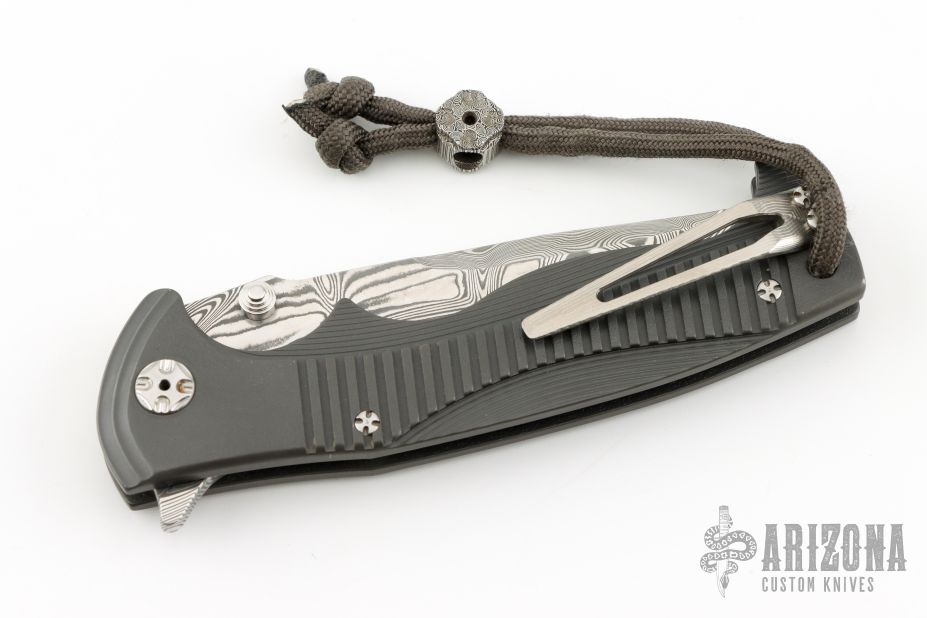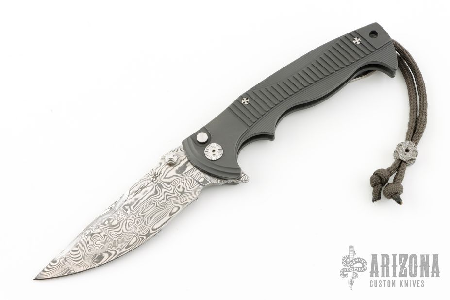 This Tighe Raid button lock flipper by Brian Tighe has a recurve Damasteel blade with dual thumbstuds and flipper. Handle is milled Zirconium with tip up milled titanium clip and lanyard hole. Nice blade seating and lockup with typical Brian Tighe seamless action. Comes with Maker's zippered case and custom lanyard bead. Has some light scratches on the frame, otherwise excellent condition.