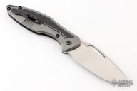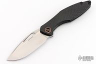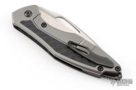 This Arius by Koenig knives features a Burnished w/ PF finished blade with thumbhole. The handle has a carbon fiber and bead blasted titanium frame with a carbon fiber inlay, copper pivot collar, black titanium tip up clip with hidden screws, and a black titanium backspacer. Has ceramic bearings and a ceramic detent ball. Nice detent, lockup and blade seating. Comes with original box and COA dated 11-19-19. Excellent condition.