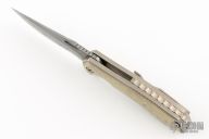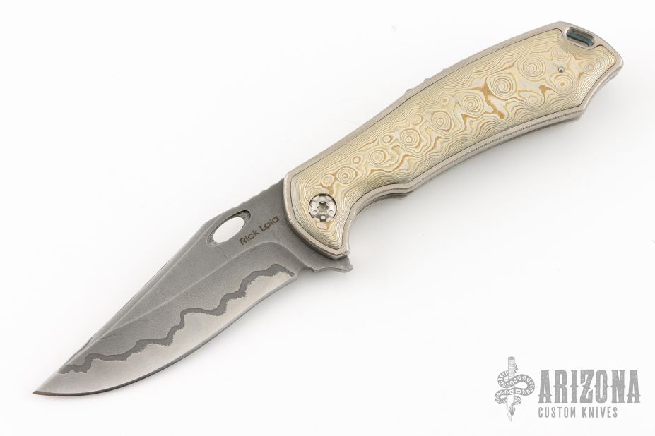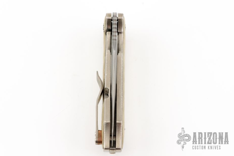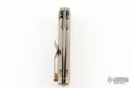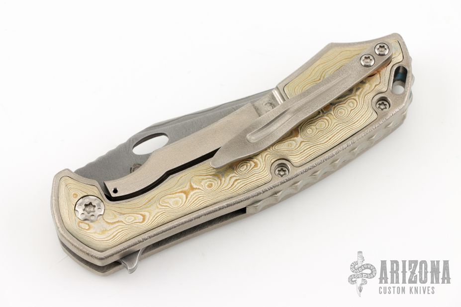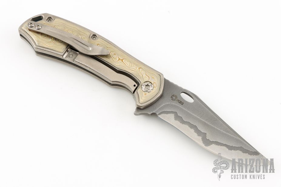 This Phantom by Korth Cutlery features a Gustavo Vilar San-Mai blade with notched thumbrest, flipper and thumbhole. The handle has an orange peel finished titanium frame, with mokume inlays, notched titanium backspacer and tip up clip, lanyard hole at the butt. Comes with leather zippered case. Features IKBS. Nice detent, lockup and blade seating. Has a couple light scuffs on the frame and clip otherwise Excellent condition.