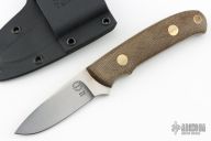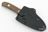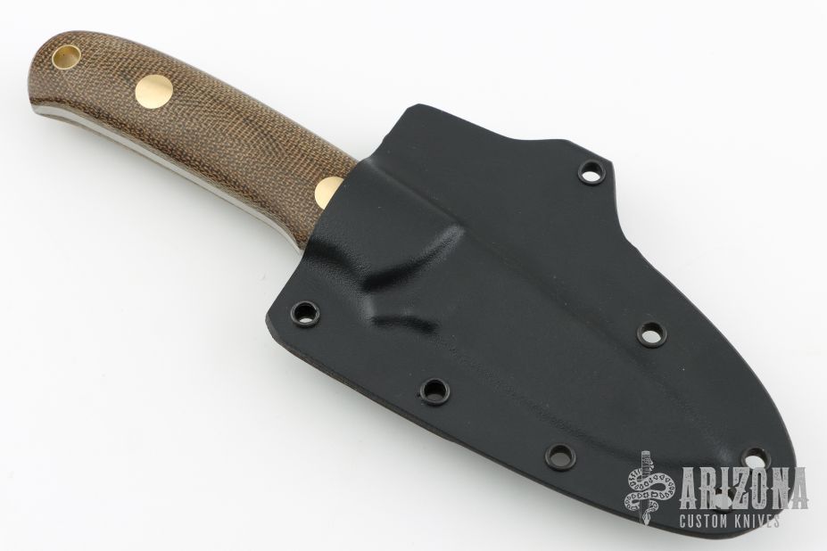 This K-14 by Dozier knives has a satin finished drop point blade with full tang construction, .124" blade stock and .835" blade depth. Has green canvas micarta scales with brass pins and lanyard hole. Comes with a kydex sheath. New from maker.