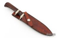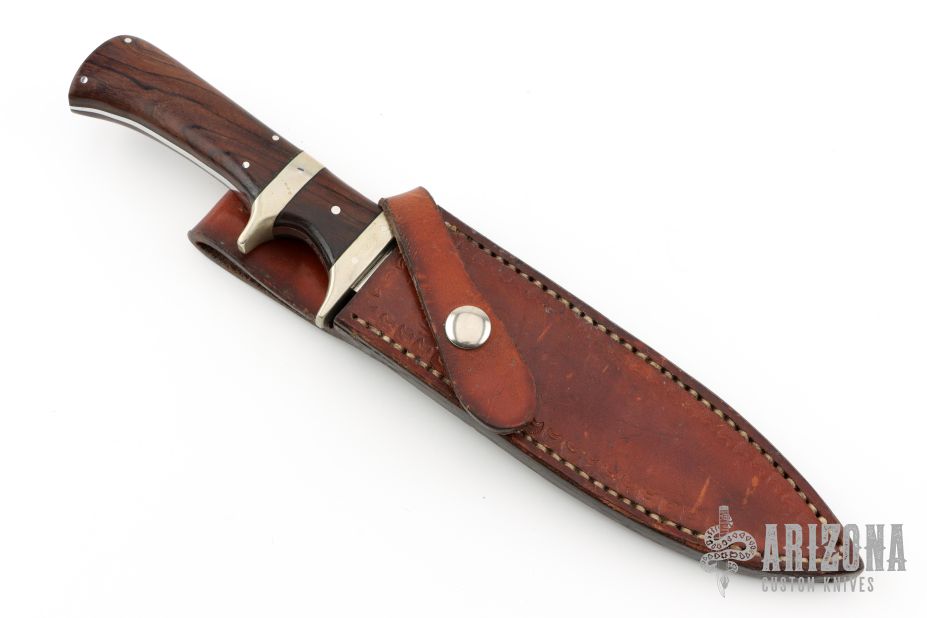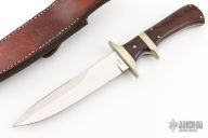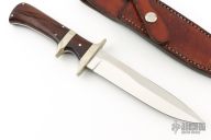 This Sub-Hilt Fighter features a mirror polished blade with sharpened top edge, .221" blade stock and 1.201" blade depth, full tang construction. The handle has a nickel silver guard and sub-hilt, wood scales with stainless steel pins and lanyard hole. Comes with a brown leather sheath. Has scuffs, scratches and rust/patina, otherwise the knife is in good condition. This knife could be cleaned up really nicely with a little elbow grease.