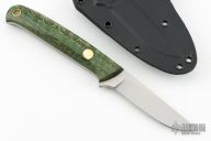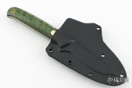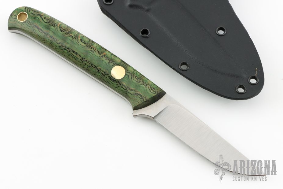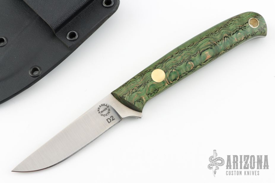 This K-20 Canoe by Dozier Knives features a satin finished blade with .126" blade stock and .648" blade depth, full tang construction. The handle has green dyed curly oak scales with brass pins and lanyard hole. Comes with kydex sheath with belt clip. New from maker.