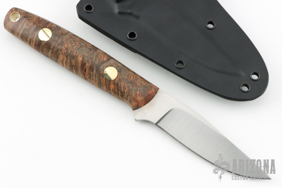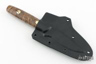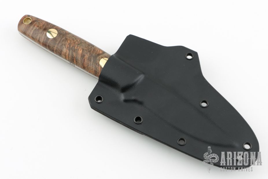This K-35 by Dozier Knives features a satin finished clip point blade with .125" blade stock and .751" blade depth, full tang construction. The handle has double dyed box eld burl wood scales with brass pins and lanyard tube. Comes with kydex sheath. New from maker.