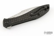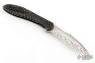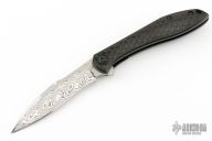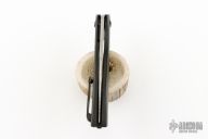 This Mongoose by Jerry Moen features a Damasteel recurve blade with notched flipper. The handle has a milled and DLC titanium frame with matching backspacer and tip up clip with ceramic ball insert, anodized titanium hardware. Has an inlaid titanium liner, rides on bearings, nice detent, lockup and blade seating. Comes with a zippered case and COA. Has a couple light scuffs, excellent condition otherwise.