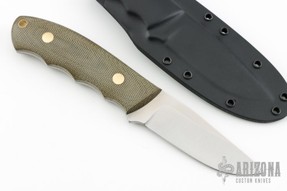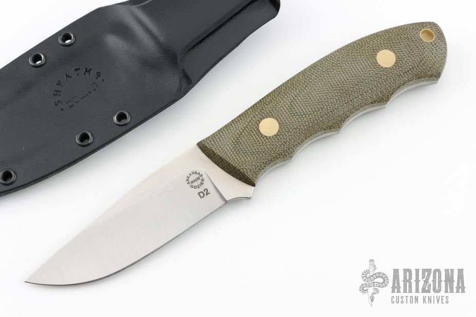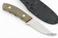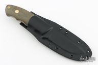 This K-21 by Dozier Knives features a satin finished clip point blade, .129" blade thickness and 1.092" blade depth, full tang construction. The handle has green canvas micarta scales with brass pins and lanyard hole. Comes with a kydex sheath. New from maker.