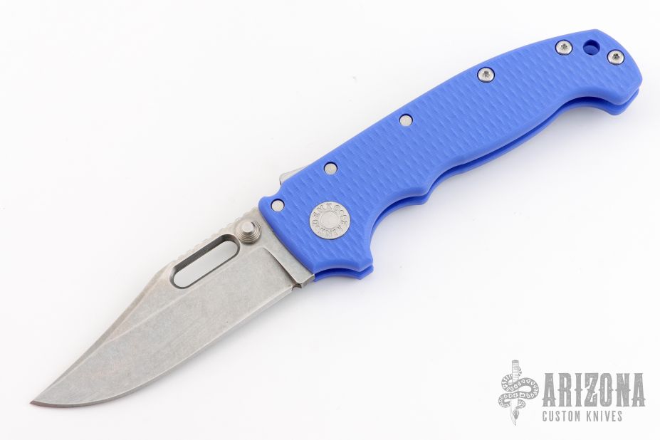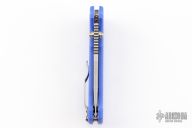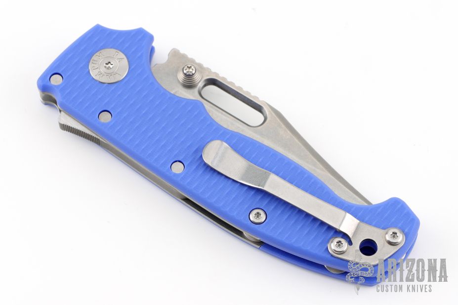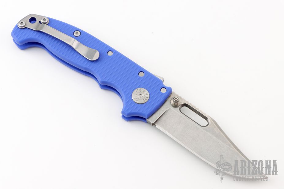 This MG AD20 by Andrew Demko features a tumbled finished blade with notched thumbrest, thumbhole and dual thumbstuds. The handle has a Blue G-10 frame with a tip up stainless steel clip and "shark" lock release on the spine. Comes with original box. Excellent condition.
