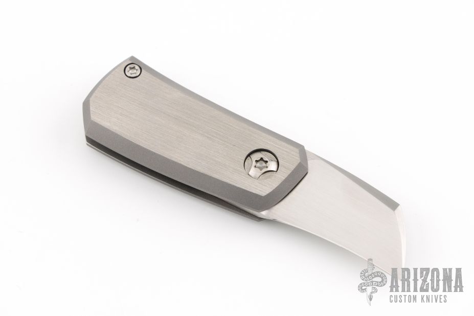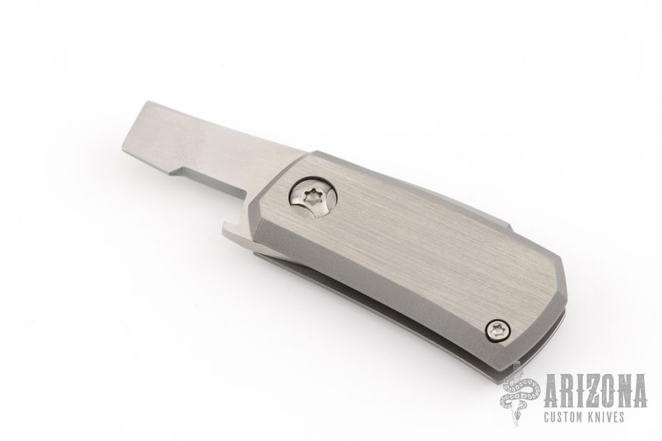 This Tengu Tool friction folder from Jared Oeser features a hand rubbed satin finished tanto blade with bottle opener and pry tool. The handle is comprised of two-tone finished bead blasted titanium with decorative fuller on the show side. Comes in a soft pouch. Excellent condition.