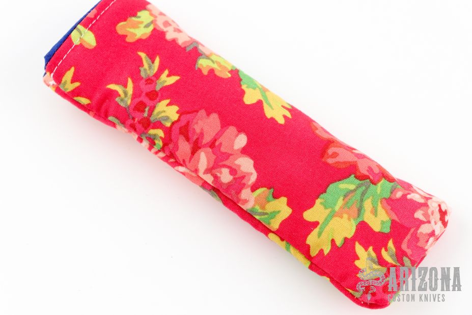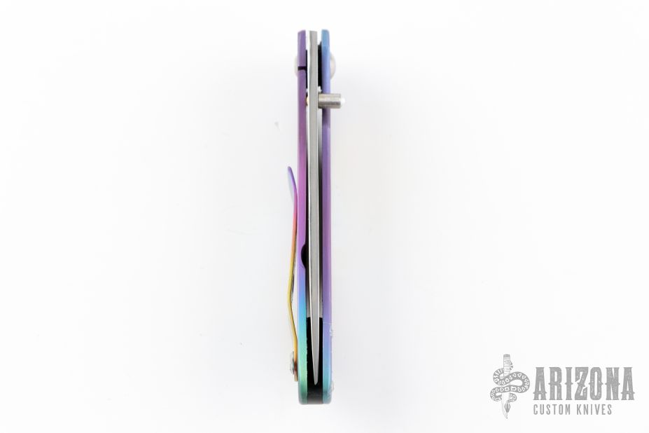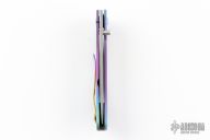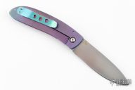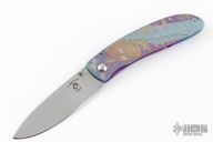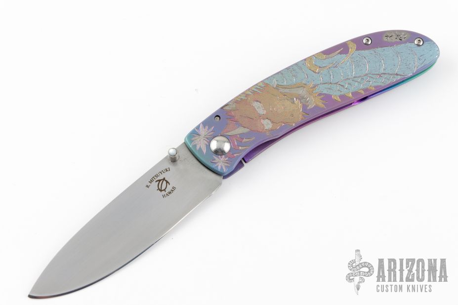This Framelock by Ross K Mitsuyuki features a hand rub satin finished drop point San Mai blade with a mother of pearl inlaid thumbstud. The blade is VG-10 clad with SUS-10. The handle has an anodized titanium frame with a tip up anodized titanium clip and black G-10 backspacer. The handle has anodized engraving of a dragon. Nice detent, lockup and blade seating. New from maker. Comes with a Velcro case and a hand written COA.