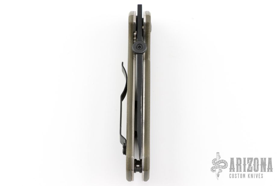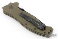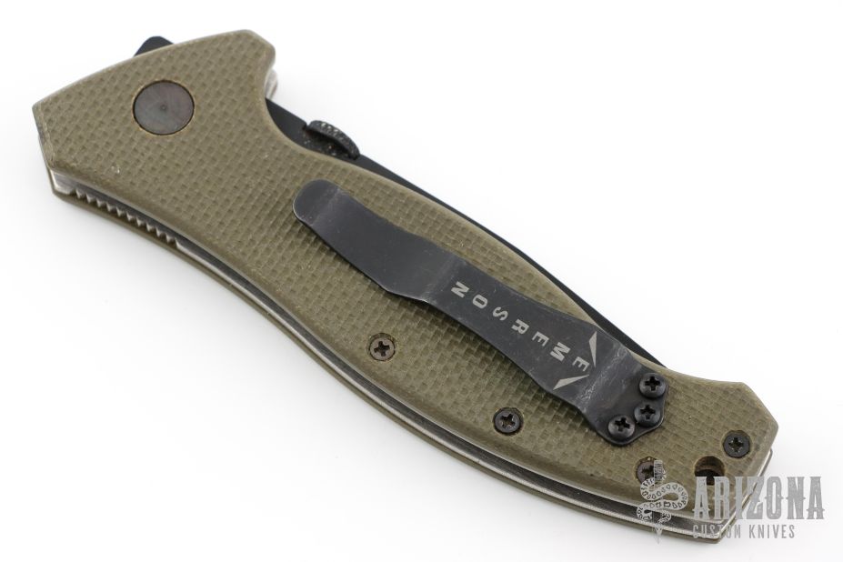 This Specwar-B by Emerson Knives features a black blade with thumb-disc. The handle has OD Green G-10 scales, titanium liners, and black stainless steel pocket clip. Comes with original box and papers. Has some light scuffs, otherwise excellent condition. Dated 2013 and S/N 2282.