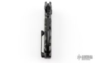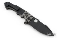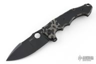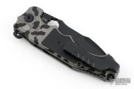 The Alpha-S knife from Andre de Villiers is a masterwork combining functionality and personality. This one has a black blade with thumbhole, notched thumbrest and flipper. It swings smoothly on a ball-bearing system and has both a thumb hole and flipper opener; it can also be opened or closed with a flick of the wrist when the G-10 inlaid button lock is held down. It has a Night Camo milled titanium handle with black G-10 inlays that offers an extremely comfortable grip. A jimped, black titanium backstrap with a lanyard hole and a tip-up, black, titanium pocket clip with hidden screws. Comes with a zippered case. "2022" on the ricasso. Excellent condition.