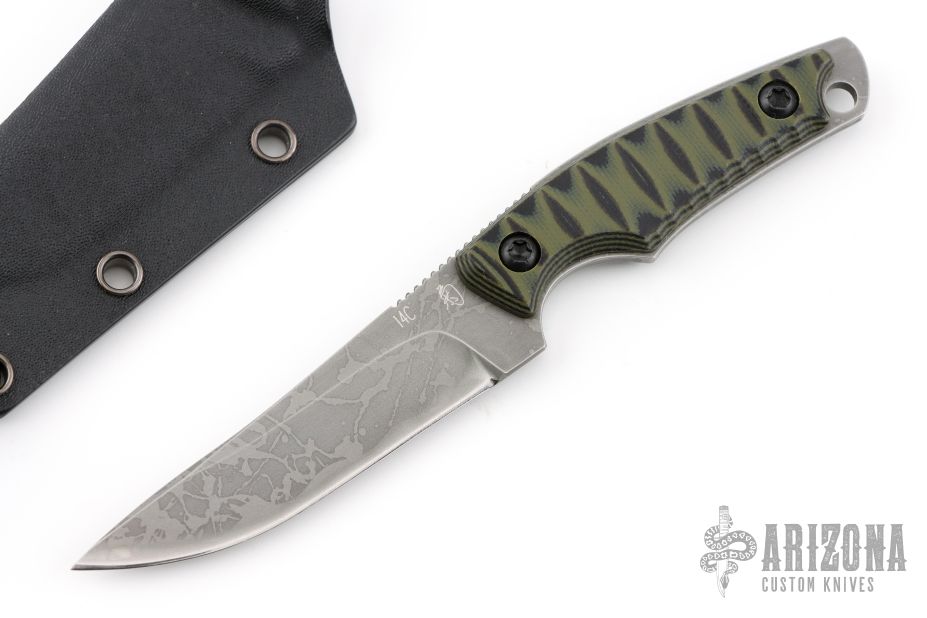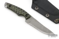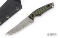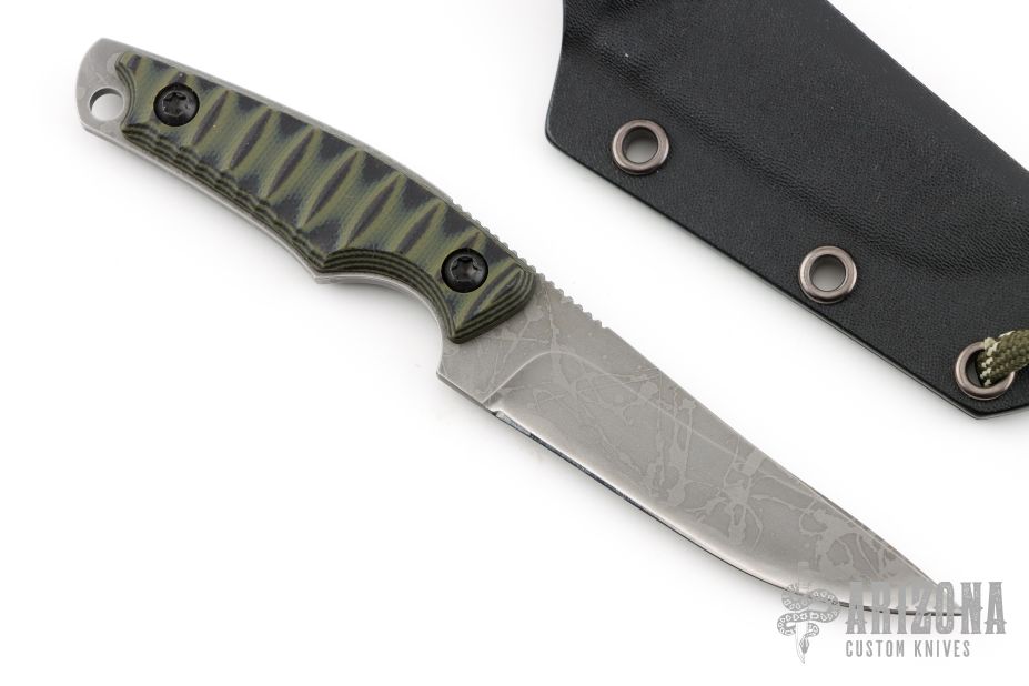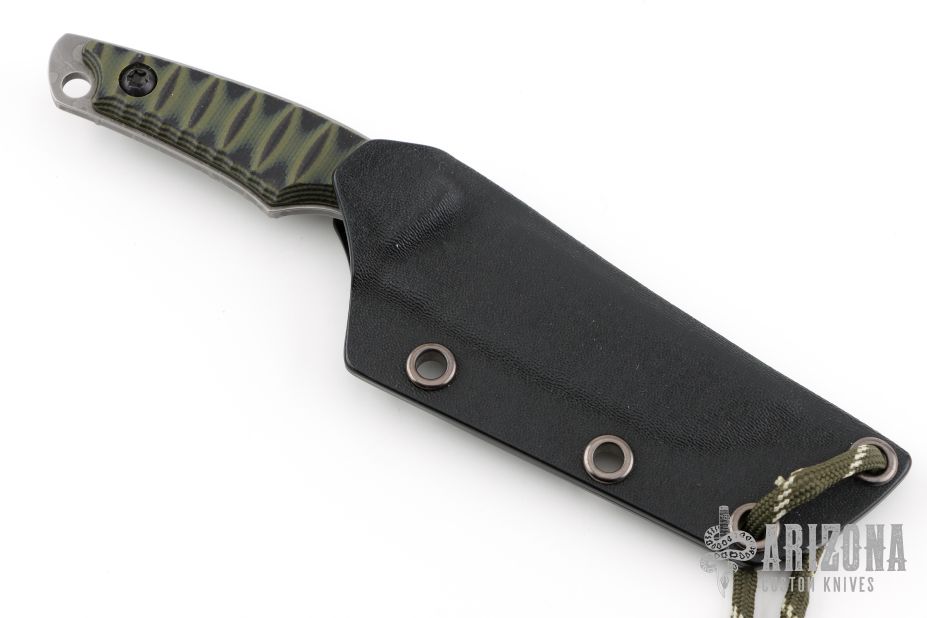 This Neck Knife by Kiku Matsuda features an acid etched blade with false top edge with notched thumbrest, .110" blade thickness and .929" blade depth, full tang construction. The handle has black/green G-10 scales. Comes with kydex sheath. New condition.
