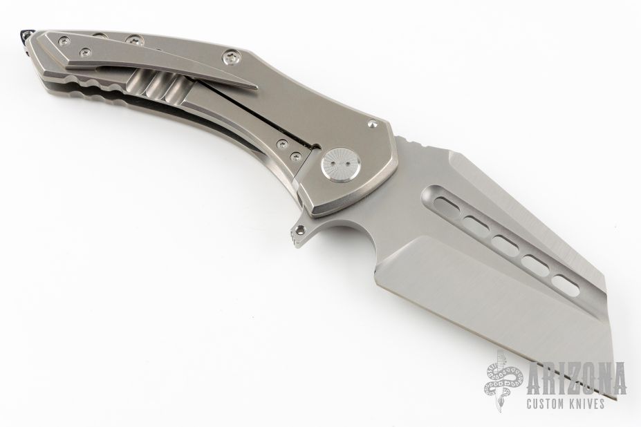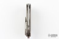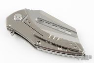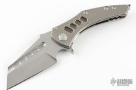 This Spectre by Sergey Rogovets features a two-tone blade with fullers, notched thumbrest and flipper. The handle has a stonewashed titanium frame with mess underlay, zirconium backspacer, tip up stonewashed titanium clip. Excellent condition. Comes with a zippered case.