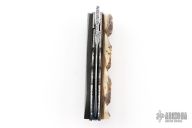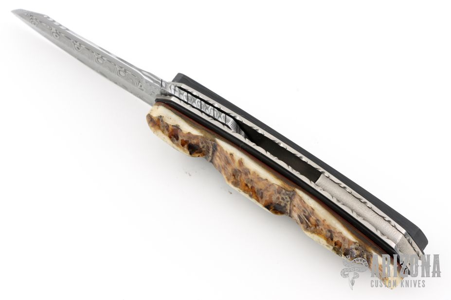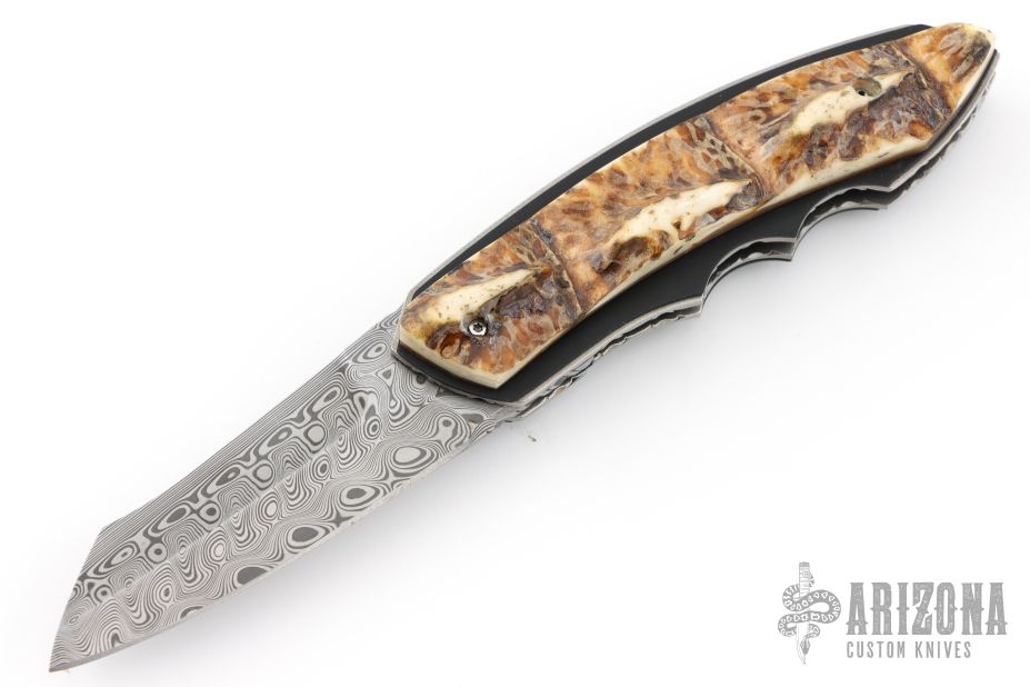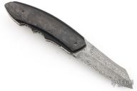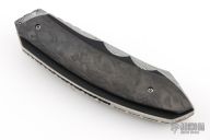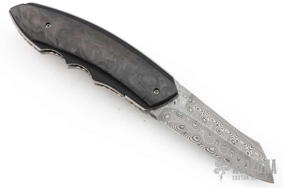 This Folding Linerlock Flipper by Corrie Schoeman has a Damasteel blade with flase top edge and fileworked spine. Handle has crocodile skin and marble carbon fiber scales with black G-10 liners, fileworked titanium liners, orange peel finished titanium backspacer. Nice blade seating, lockup and detent. Rides on bearings. New from maker. Comes with a COA dated January 2024.