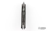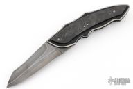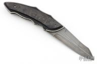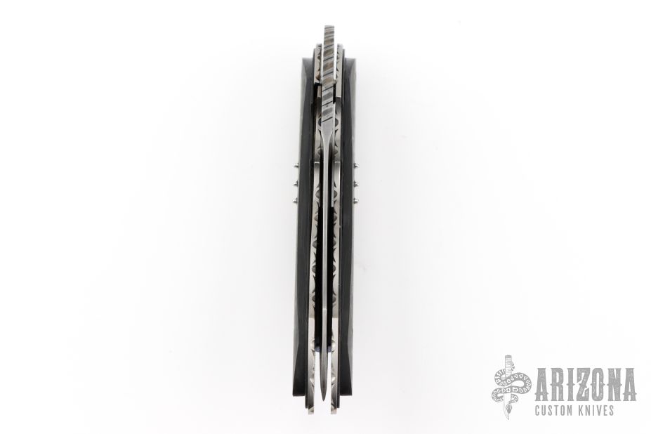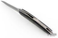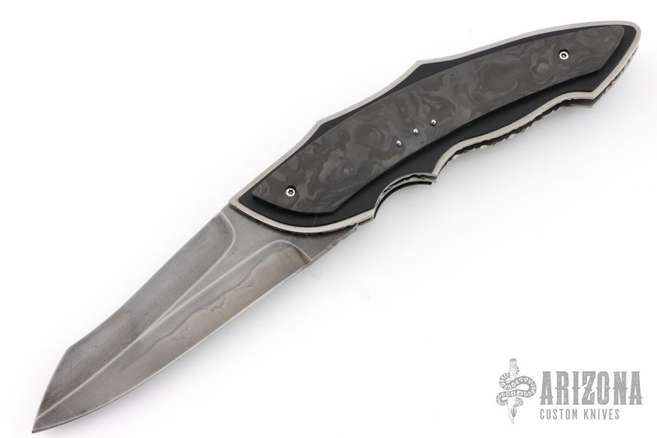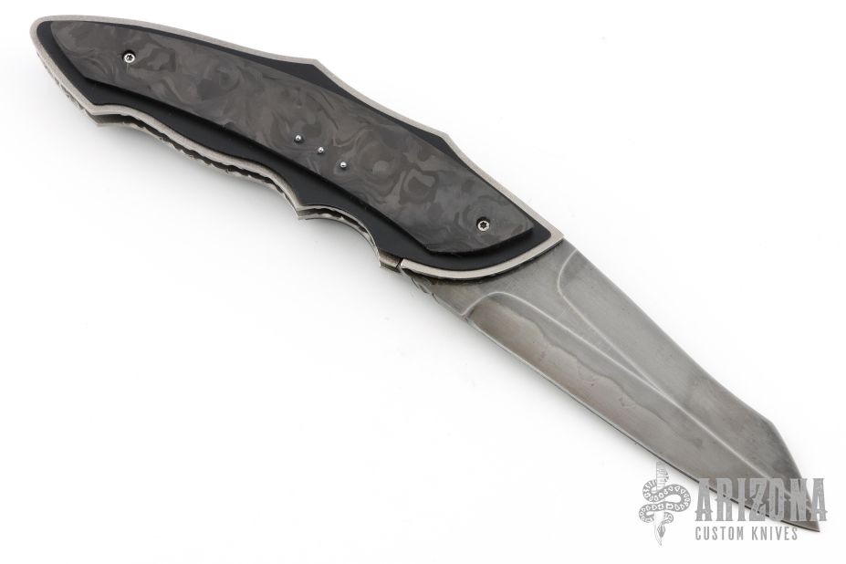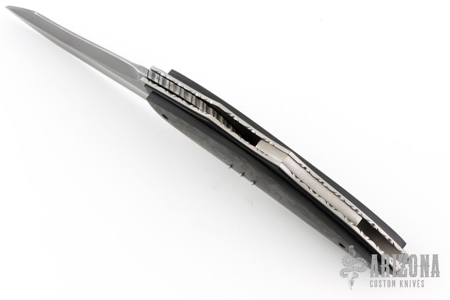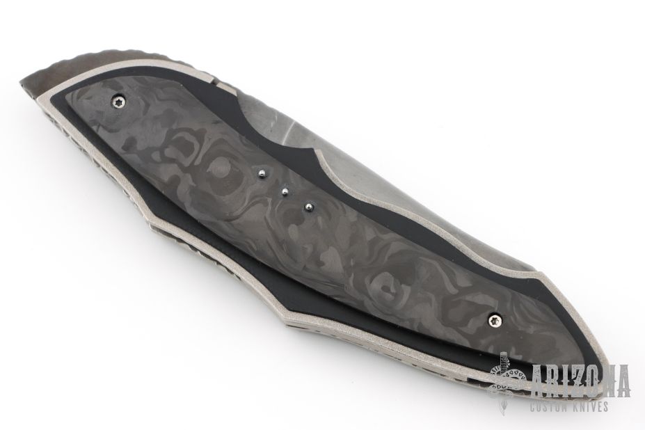 The X Ecute Front Flipper by Corrie Schoeman features a blade with a false top edge, hamon, fileworked spine and under ricasso. The handle has a marble carbon fiber scales over black G-10, fileworked titanium liners and orange peel finished titanium backspacer. Rides on bearings, nice detent, lockup and blade seating. New from maker. Comes with a COA dated May 2024.