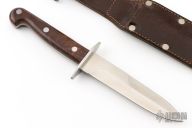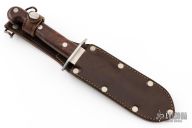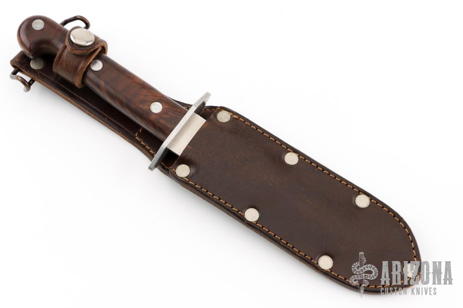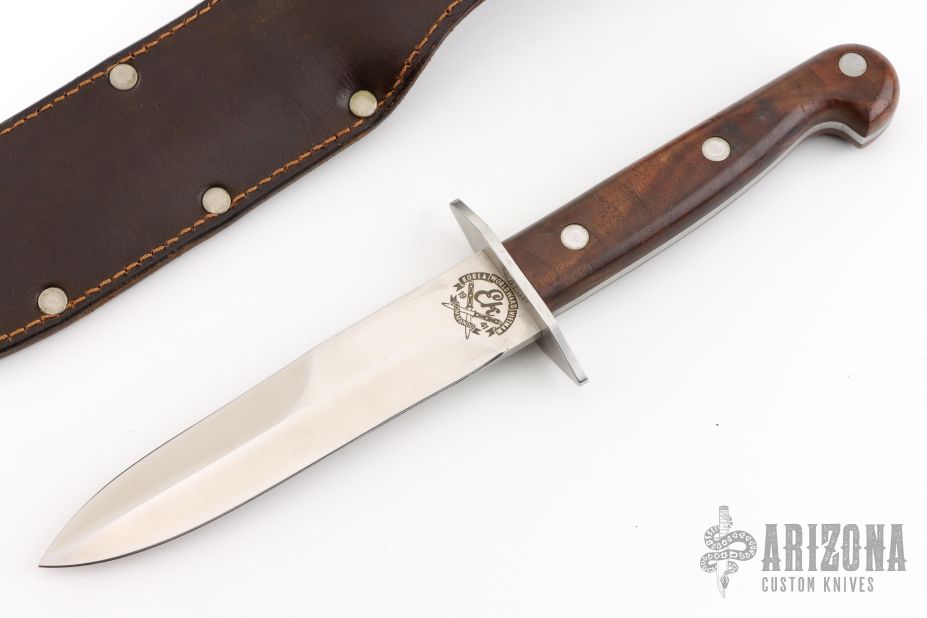 This Aussie Bowie by EK Knives features a satin finished blade with sharpened top edge, .150" blade stock and 1.161" blade depth, full tang construction, with top edge sharpened. Has stainless steel guard and walnut scales. Comes with a brown leather sheath and a zippered case. Has some light scratches, otherwise excellent condition.