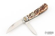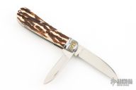 This gorgeous 2-blade from Mike Zscherny features hand-rubbed, satin finished blades with nail nicks. Springs on both blades are flush in the closed, half-stop, and open positions. Both blades sit centered in the handle in the closed position. Nice walk and talk. The handle has beautifully engraved fluted and pinched bolsters, and escutcheon. Fantastic work... Excellent condition. Engraved by: Mitch Moscetti.