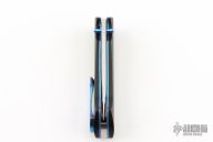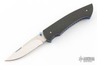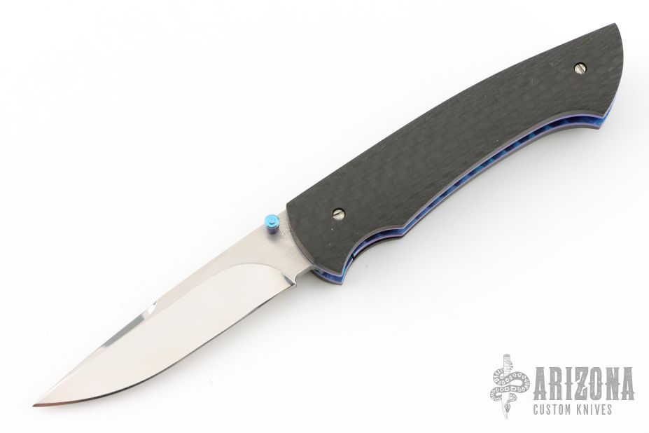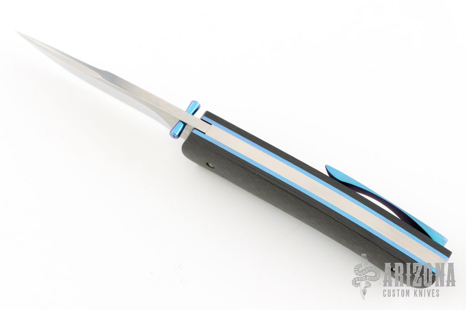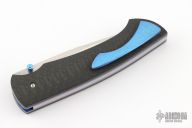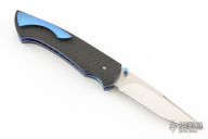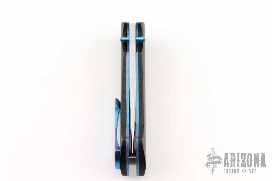 This Sparrowhawk Scale Release D/A Auto from William Tuch features a two-tone blade with dual anodized titanium thumbstuds. The handle features carbon fiber scales, anodized titanium liners with jeweled interiors, stainless steel backspacer, and tip up anodized titanium pocket clip with hidden screws. Nice detent, lockup and blade seating, strong action. Comes in a leather pouch. Excellent condition.
