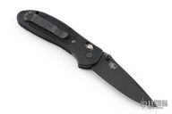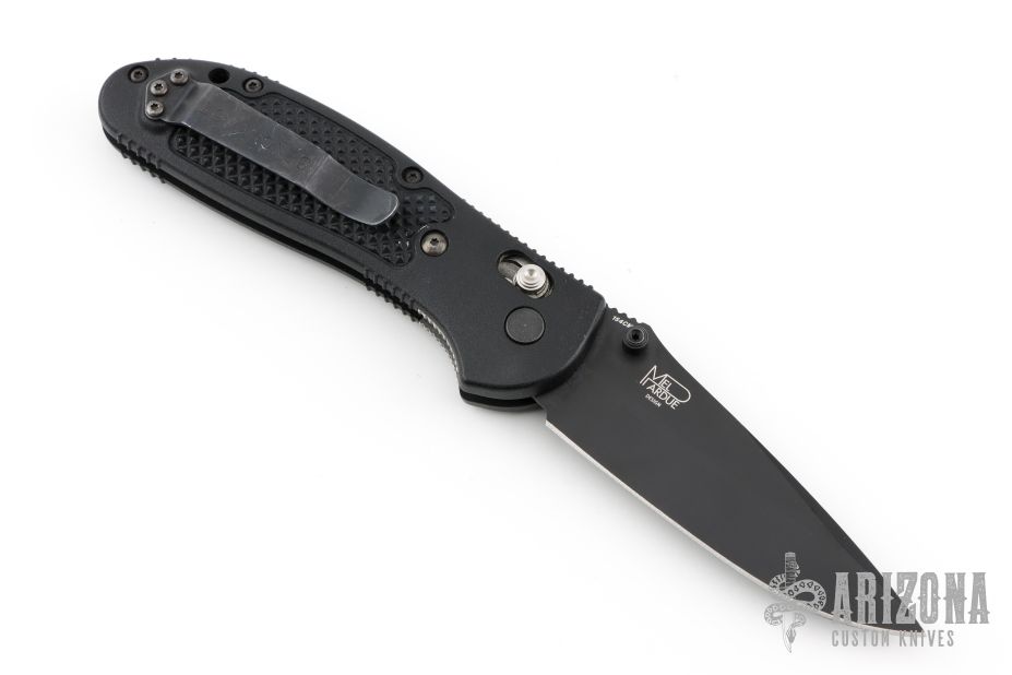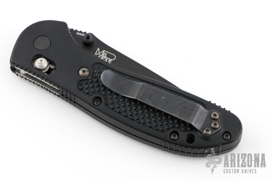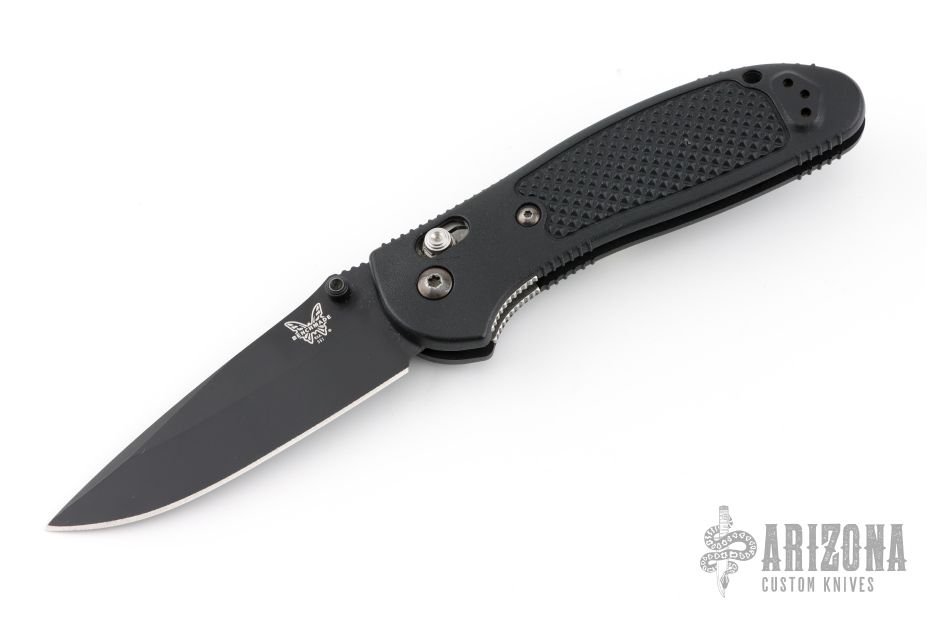 This Griptilian by Benchmade features a black blade with swedge, notched thumbrest and dual thumbstuds. The handle has textured FRN scales with a black stainless tip up pocket clip. The pocket clip can be reversed for right or left tip up carry. The AXIS lock system makes the knife easy to open and easy to close. Comes with original box and papers. Has a few light scuffs, otherwise excellent condition.