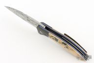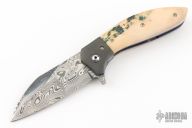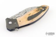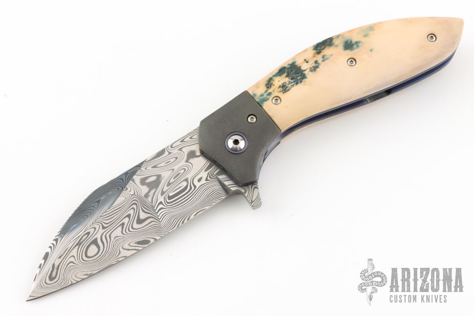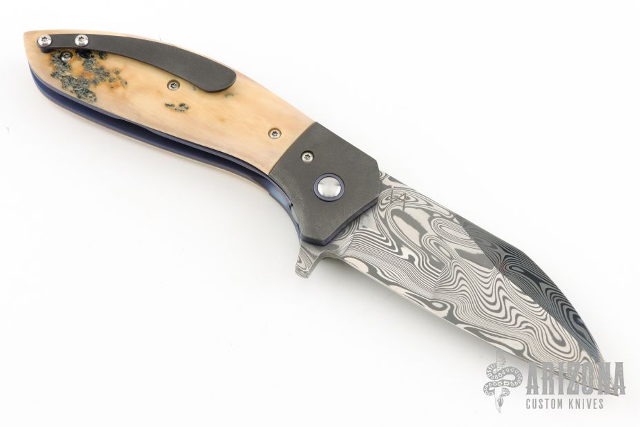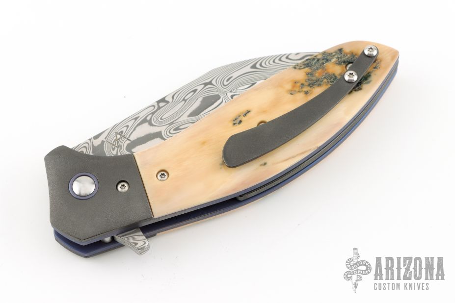 This Odin by Simon V Anderson features a Damasteel sheepsfoot/wharncliffe blade with dual thumbstuds with ceramic ball inlays. The handle has orange peel finished zirconium bolsters, floating backspacer, tip up clip, and heirloom fit mammoth covers. Nice detent, lockup and blade seating. Comes in a soft pouch. Excellent condition.