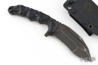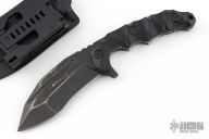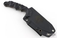 This Kobra by Lotar Combat features a black recurve blade with a notched thumbrest and fullers, .200" blade stock and 1.600" blade depth, full tang construction.  The handle has contoured black G-10 scales.  Includes a black kydex sheath. The finish on the blade and tang has some wear, otherwise good condition.