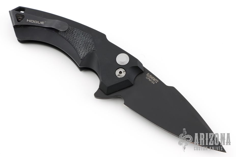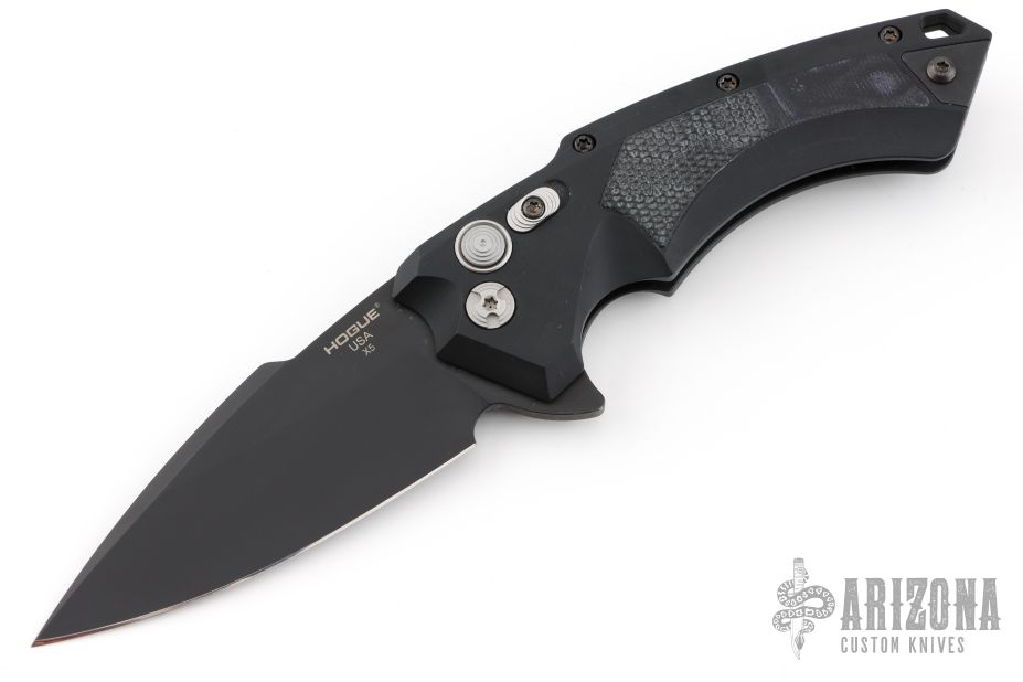 This X5 by Hogue is an Allen Elishewitz design with a black blade. The handle has a black aluminum frame with black/grey G-10 inlays,  tip up reversible stainless steel clip. Comes with original box, nylon zippered case and extra clip. Excellent condition.
