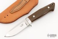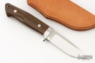 This Loveless Style Drop Hunter by Chad Nell features a mirror polish blade with .143" blade stock, .1035" blade depth, full tapered tang construction. The handle has a stainless steel guard, red fiber liners, and micarta scales, lanyard hole at the butt. Excellent work. Comes with a brown leather sheath. Excellent condition.