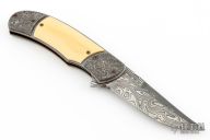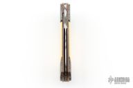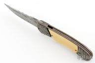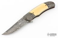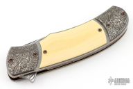 This linerlock by Tony Karlsson features a Damasteel blade with heavy acid etch finish, swedge, and flipper tab. The handle has an orange peel finished titanium frame, Doug Ponzio Damascus bolsters, front and rear, Westinghouse overlays, and silver liners. Matching heavy etch Damasteel backstrap. Nice blade seating and lockup. Comes with Maker's wooden box, and zipper case. Excellent condition.