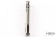 The Rockwall by Tactile Knife features a stonewashed blade with notched thumbrest and dual thumbstuds. The handle has a milled titanium frame with a tip up stainless steel clip and backspacer. Comes with original box and COA. Appears to have been resharpened, probably on a Wicked edge type sharpener, it is well done, otherwise excellent condition.