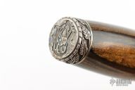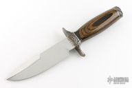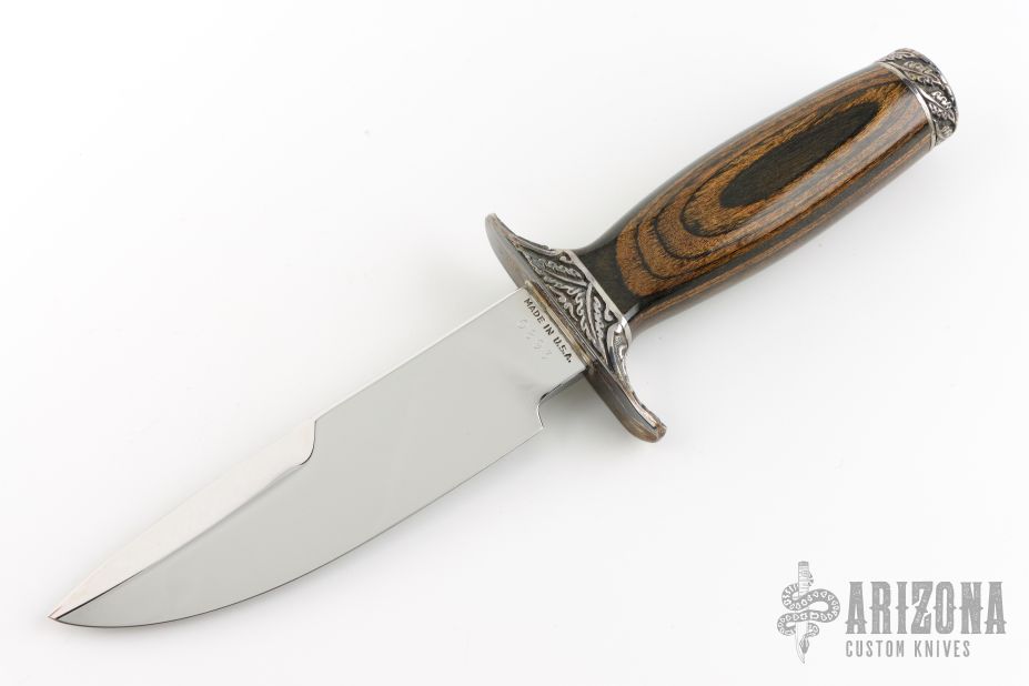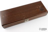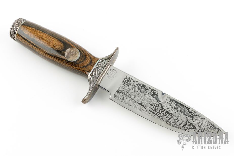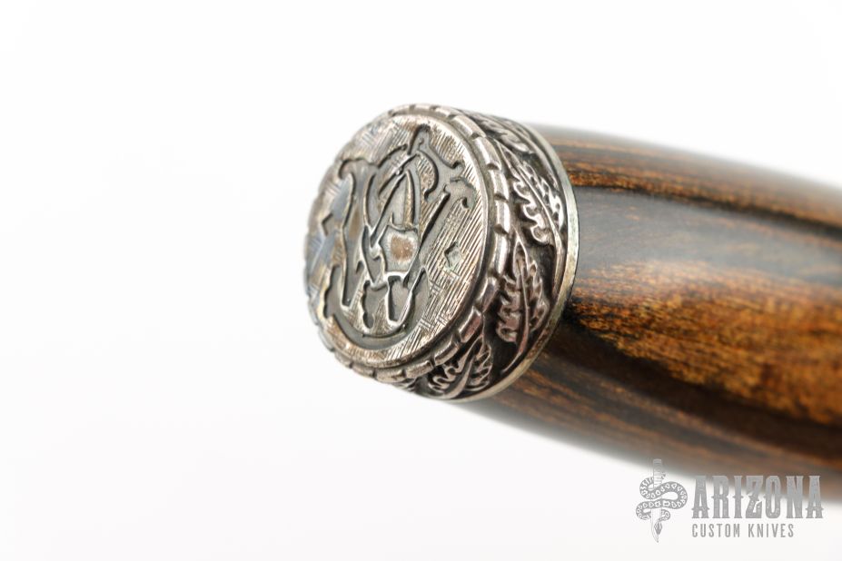 This Collectors Series Limited Edition knife by Smith and Wesson has the serial number of 0893. The blade features a polished and laser engraved graphic. .235" Blade Stock. 1.325" Blade Depth. The handle is comprised of a sterling silver guard and pommel with dymondwood handle over hidden tang construction. Sterling Silver inlay marked "Collectors Series 0893" on "B" side of handle. Includes the original wooden display case. Has some light patina, otherwise excellent condition.