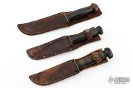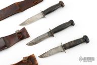 This USN Knife from Robeson ShurEdge Knives has a satin finished clip point blade with false top edge, .145" blade stock and 1.101" blade depth, hidden tang construction. The handle has a steel guard, stacked leather grip and wood butt. Comes with original brown leather sheath but the keeper is missing. Has some scratches and patina, has been resharpened and used, otherwise good condition for its age.