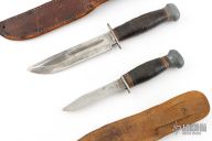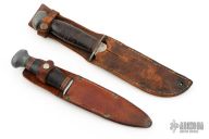 This RH-50 from PAL Cutlery features a clip point blade with .129" blade stock and .807" blade depth, hidden tang construction. The handle is comprised of a steel guard, red/white/black spacers, stacked leather grip and aluminum pommel. Includes leather sheath with belt loop. Has some oxidation and scratches, has been resharpened alot, the guard is a little loose, otherwise fair condition for its age. 4.125" blade and 8.25" overall.