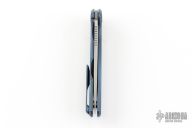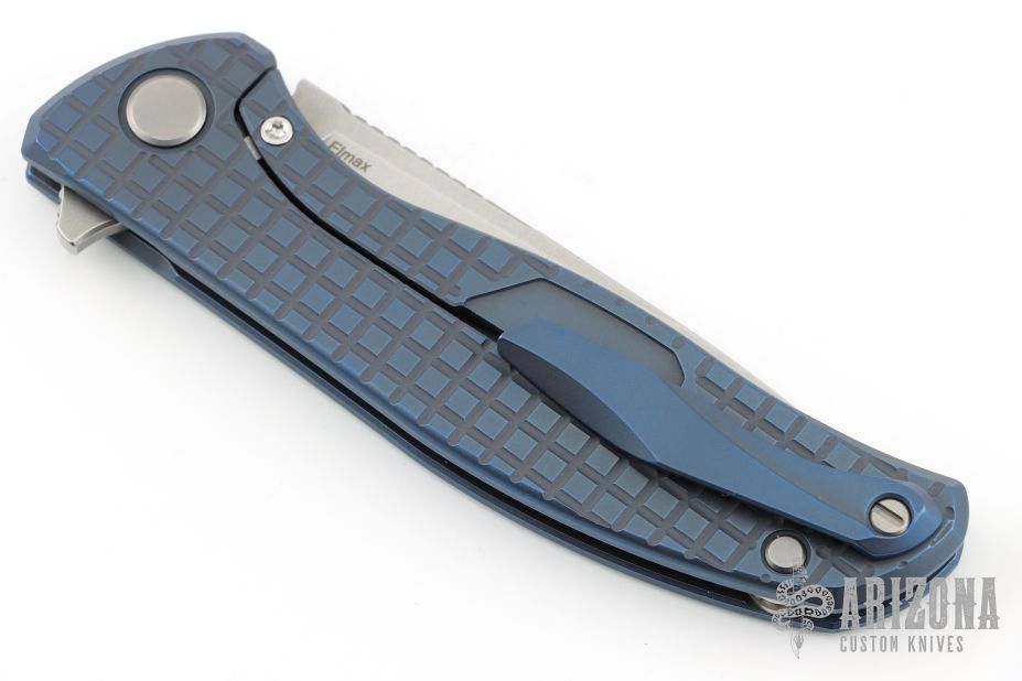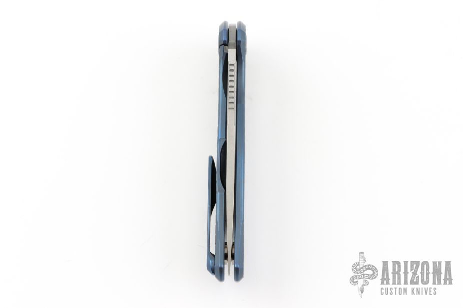 The Frame: The scales are titanium in Monkey Edge FRAG Pattern with a tumbled blue anodized finish. Machined titanium pocket clip with matching finish. Custom pivot, scale hardware and clip screw with blasted finish