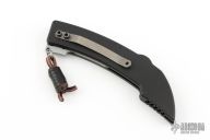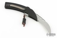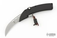 This Arc Angel by Rob Dalton features a bead blasted hawkbill style blade. The handle is comprised of black anodized aluminum with charging tab. Tip down titanium pocket clip. Excellent condition.