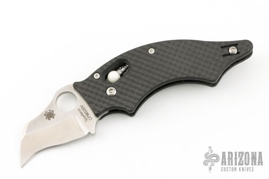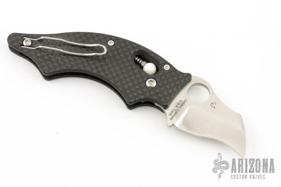 This Sprint Run DoDo by Spyderco features a satin finished hawkbill S30V blade with thumbhole. The handle is carbon fiber with a tip up clip, right or left carry. Axis lock with white ball. Excellent condition.