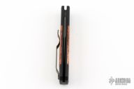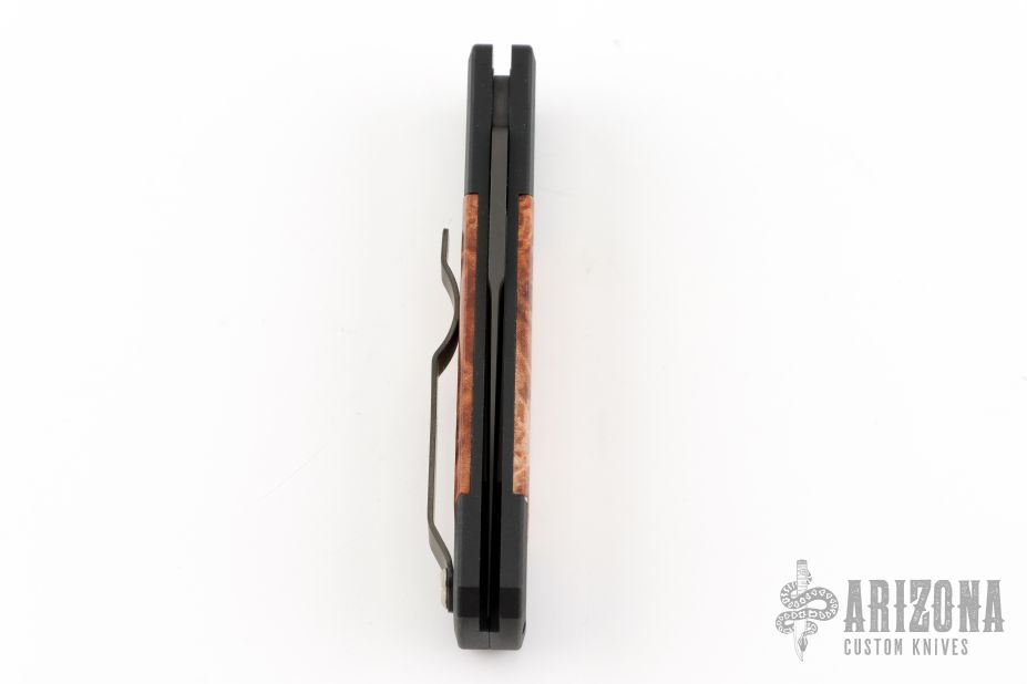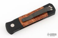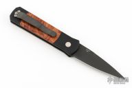 This 707 Godson from Pro-Tech Knives features a black coated spear point blade with swedge. The handle is comprised of a black anodized aluminum frame, Maple Burl inlays, with a black coated stainless steel tip up clip. Includes original box and paperwork. Excellent condition.