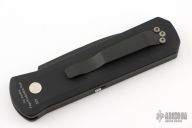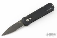 The frame is etched First Production Run, Serial Number 529, and has Blackie Collins' signature. Blade Steel: 154 CM Black Coated Hollow Ground blade with partial serrations. Comes in the wrong Pro-Tech box, with papers. Has scuffs and scratches, great condition otherwise.