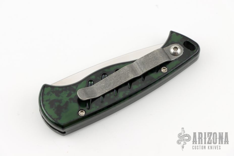 The Pocket by Piranha Knives features a mirror polished drop point blade with anodized aluminum handle with tip up titanium clip. Lanyard hole. Smooth opening, strong lockup. Excellent condition.