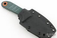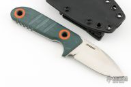 This Outdoorphin features a hollow ground satin finished blade with notched thumbrest, .162" blade thickness and 1.331" blade depth, full tang construction. The handle has green G-10 scales with orange G-10 inserts.