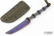 This TSK-YT by Mummert Knives features a satin and tumble finished tanto anodized titanium blade with carbidized edge, .191" blade stock and 1" blade depth, integral construction with paracord wrap. Comes with a green kydex sheath. Has some sheath scratches, otherwise excellent condition.